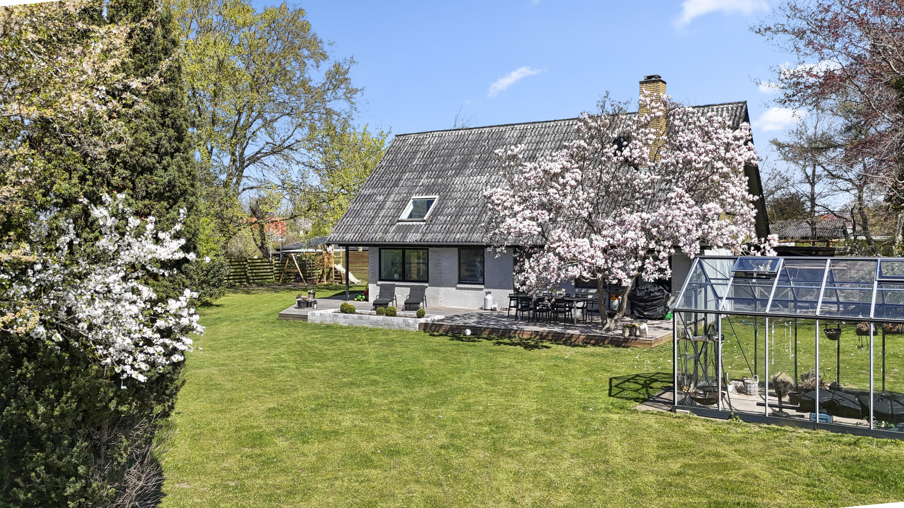 Grunden omkring villaen er noget helt for sig. Haven er en sand oase – ugeneret, frodig og alligevel overskuelig. Her blomstrer livet i smukke bede, og drivhuset giver mulighed for at dyrke egne grøntsager eller blot nyde det grønne univers. Et imponerende magnolietræ står som havens naturlige midtpunkt og bidrager med både elegance og årstidernes skiftende udtryk.